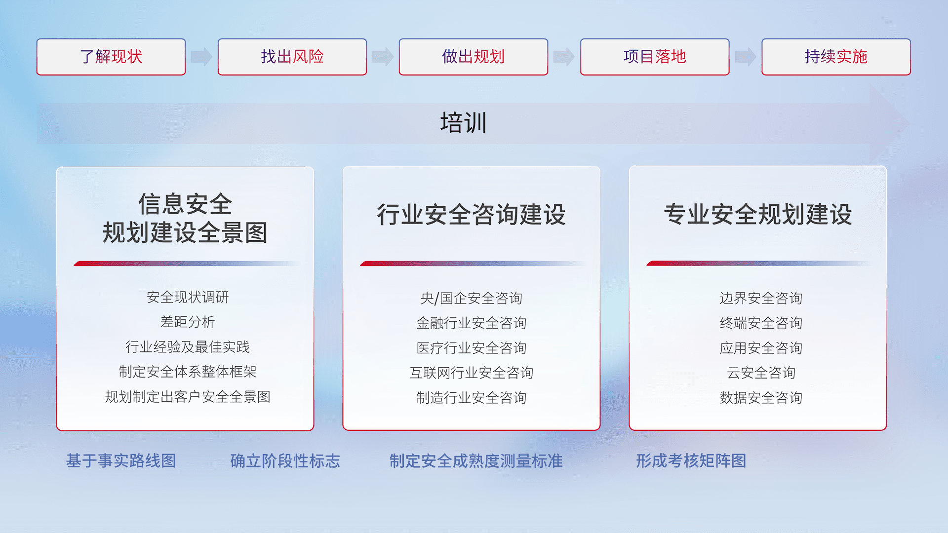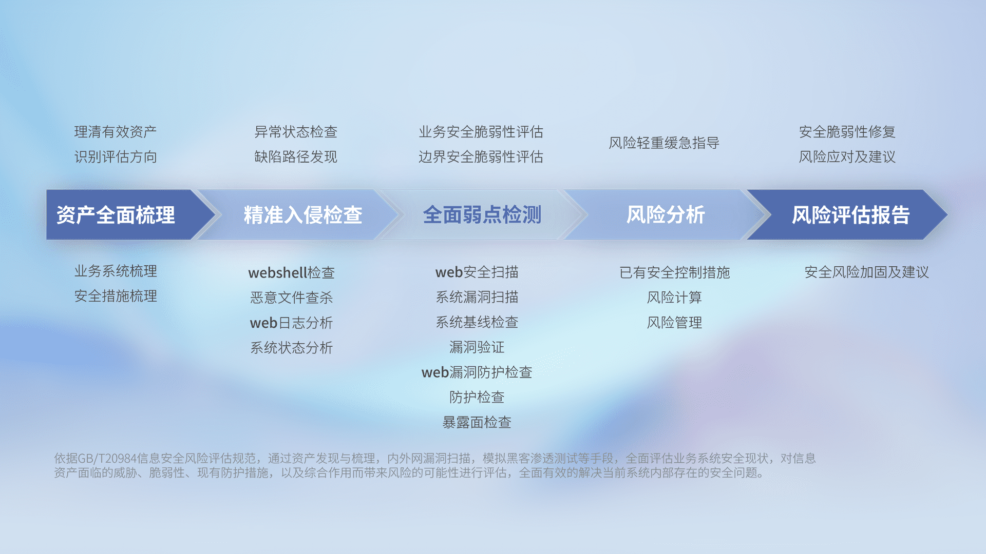 针对客户行业特性,,,,以专业的安全服务+多厂商联合解决方案提供专属的一站式安全管理服务,,帮助客户全面感知网络空间威胁,,,,基于识别、、、、检测、、、、分析、、防护、、、、监测、、、响应的服务理论模型,,,,从方案咨询、、集成交付、、评估验证、、、、优化加固、、、运维运营,,,,致力于为客户提供完整的闭环管理式安全服务。。以实战经验为客户打造高抵御风险的安全体系,,,帮助客户发现威胁、、、、对抗威胁、、处置威胁,,,,不断积累安全对抗能力,,持续保障数字化安全。。。